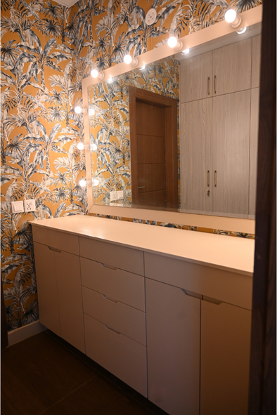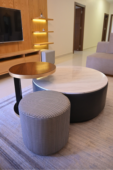 With a clear vision of the form and function of their summer escape, we began creating the moodboard around their need to entertain large groups of friends and family, following a modern aesthetic that remained classy and sophisticated by playing with patterns and textures against a mostly neutral palette. Smoky grey, frosty blue and sage green wintry tones were complimented with accents of marble and gold. Natural oak, a favorite spread throughout the apartment, contrasted with surprise pieces crafted in rich sheesham. Cinnamon beige hues broke the dominance of cooler colors, their warmth played up with buttery velvet suedes. The finished product is highly functional, pragmatic yet stylish and easy to maintain for a small family.